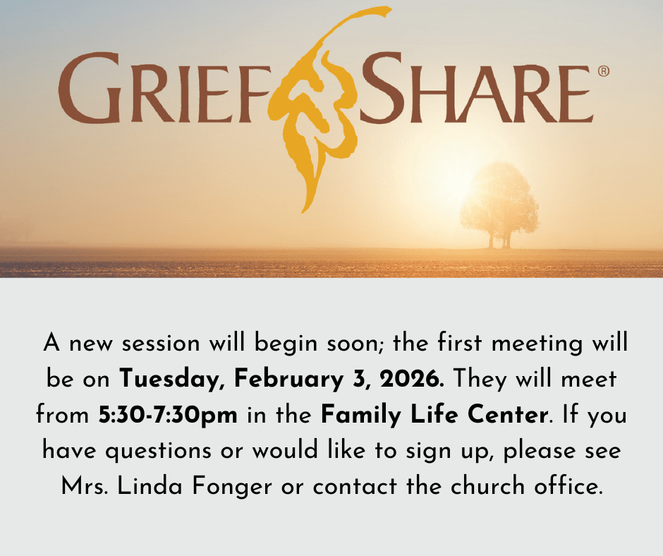 GriefShare will be led by Mrs. Linda Fonger, and will meet in the Family Life Center. There is no charge to attend.